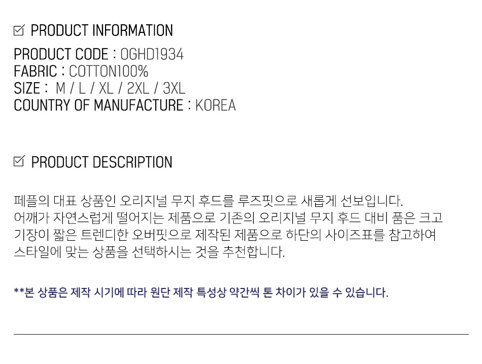특징 페플의 대표 상품인 오리지널 무지후드를 루즈핏으로 새롭게 선보입니다. 어깨가 자연스럽게 떨어지는 제품으로 기존의 오리지널 무지 후드 대비 품은 크고 기장이 짧은 트렌디한 오버핏으로 제작된 제품으로 하단의 사이즈표를 참고하여 스타일에 맞는 상품을 선택하시는것을 추천합니다.