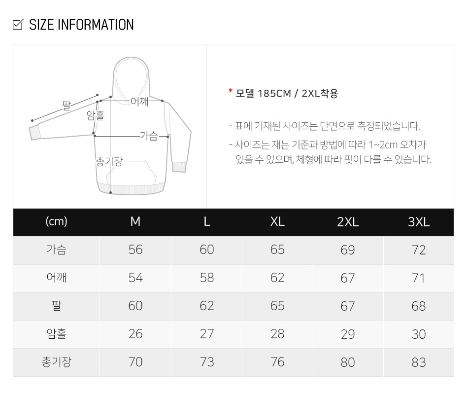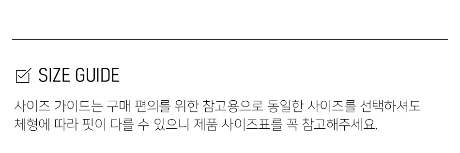 제품 제작 과정에서 같은옷에 같은 사이즈더라도 1~3cm정도의 오차는 발생할 수 있습니다. 그러므로 약간의 사이즈 오차로 인한 교환/반품은 불가합니다.