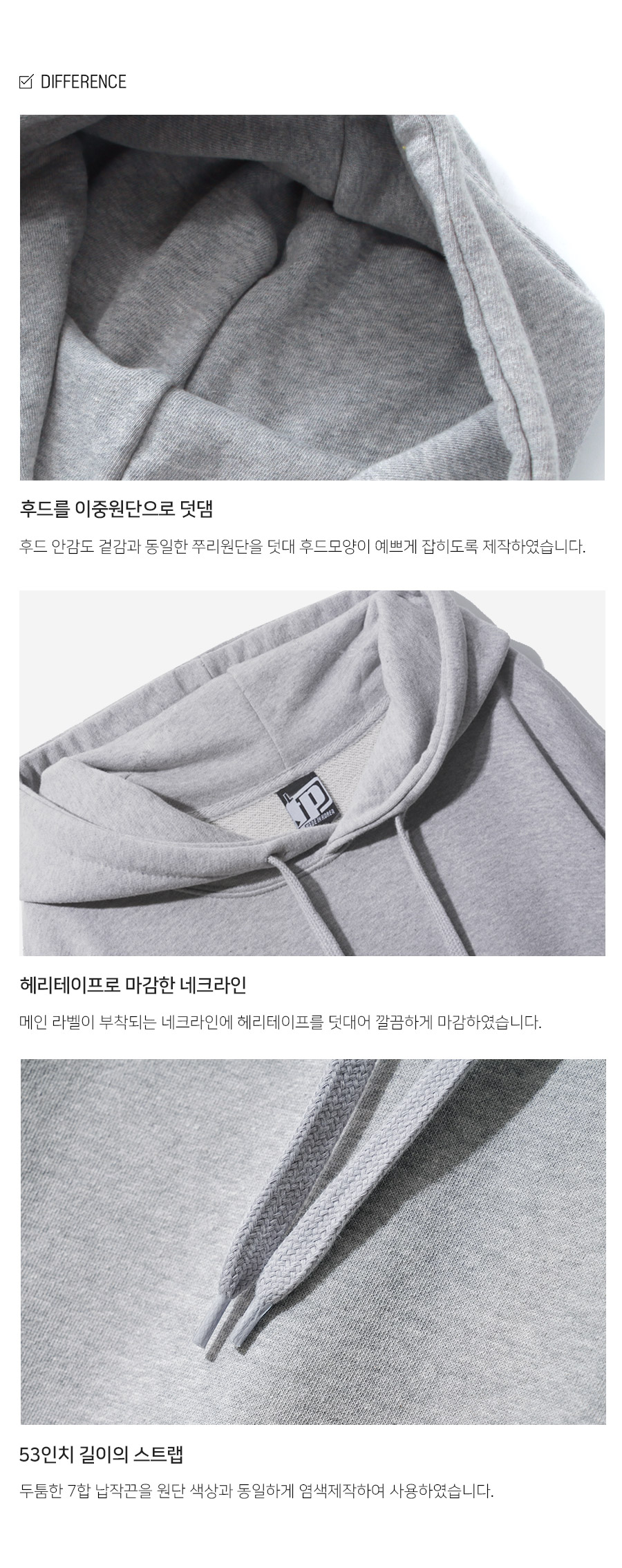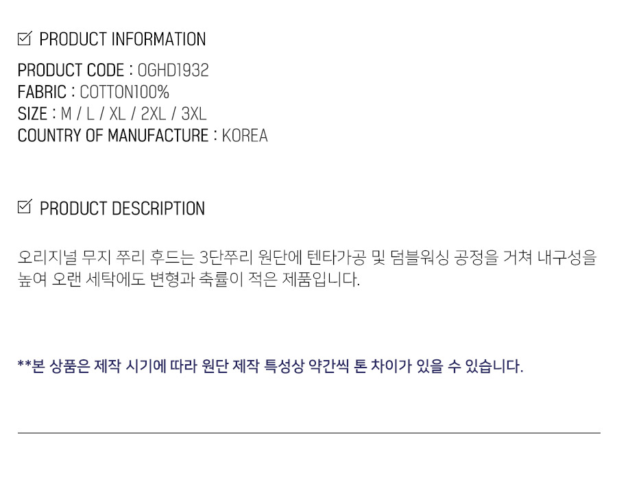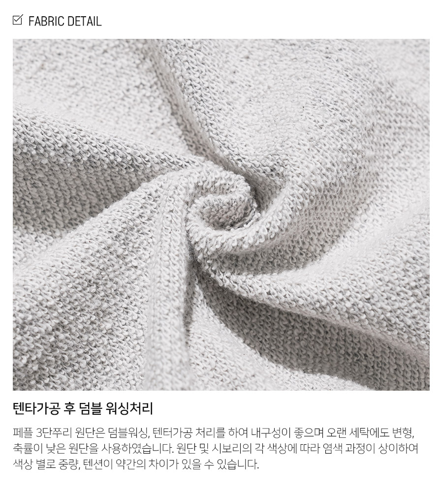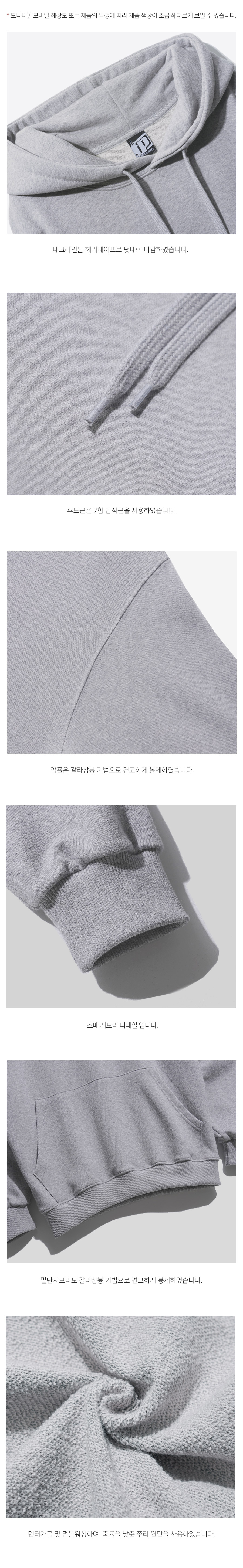 특징 오리지널 무지 쭈리 후드는 3단 쭈리 원단에 텐타가공 및 덤블워싱 공정을 거쳐 내구성을 높여 오랜 세탁에도 변형과 축률이 적은 제품입니다.