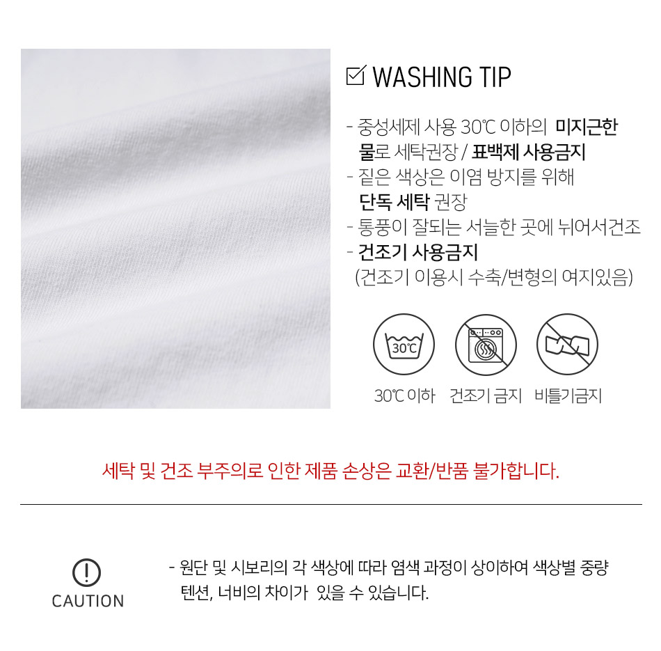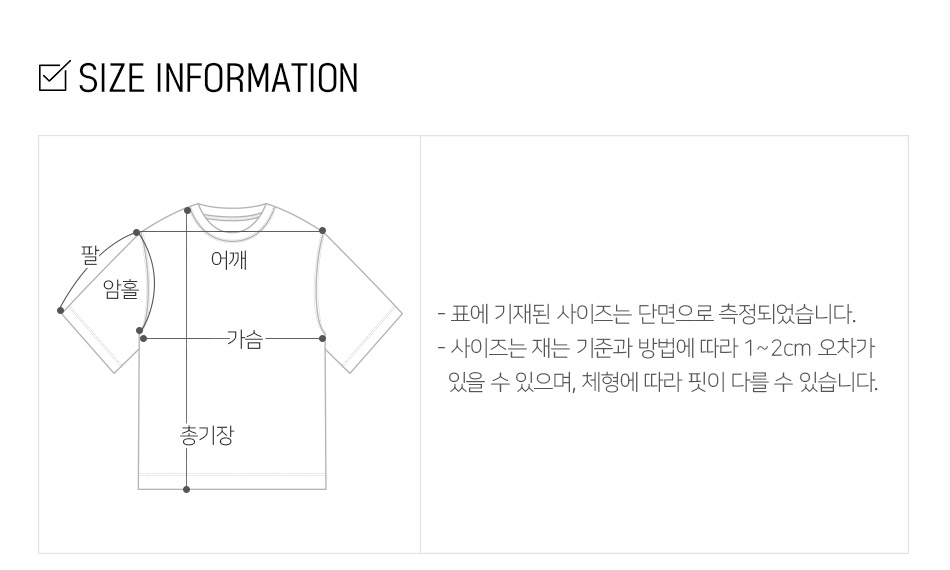 제품 제작 과정에서 같은옷에 같은 사이즈더라도 1~3cm정도의 오차는 발생할 수 있습니다. 그러므로 약간의 사이즈 오차로 인한 교환/반품은 불가합니다.