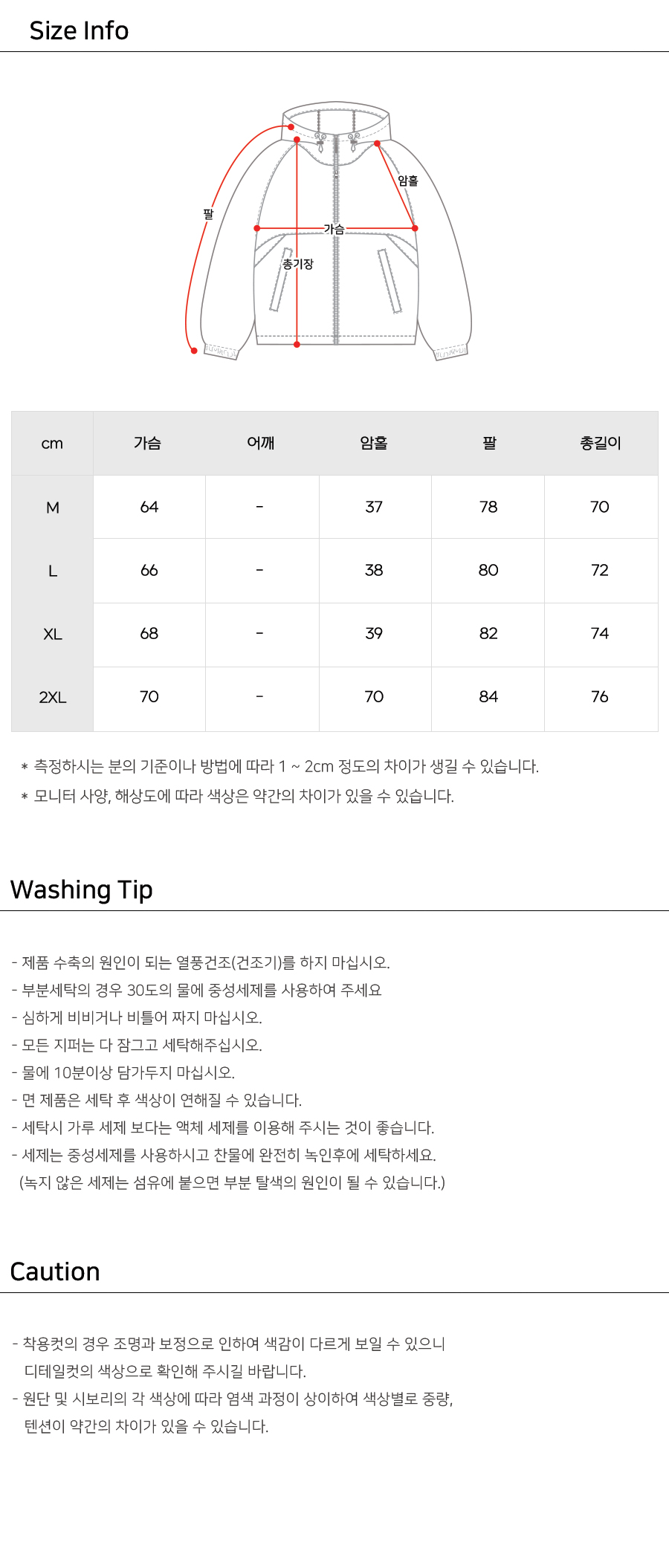제품 제작 과정에서 같은옷에 같은 사이즈더라도 1~3cm정도의 오차는 발생할 수 있습니다. 그러므로 약간의 사이즈 오차로 인한 교환/반품은 불가합니다.