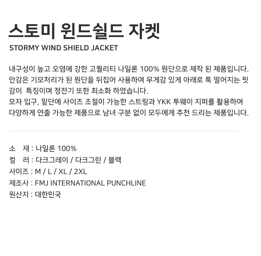 특징 내구성이 높고 오염에 강한 고퀄리티 나일론 100% 원단으로 제작된 제품입니다. 안감은 기모처리가 된 원단을 뒤집어 사용하여 무게감 있게 아래로 툭 떨어지는 핏감이 특징이며 정전디 또한 최소화하였습니다. 모자입구, 밑단에 사이즈 조절이 가능한 스트링과 YKK 투웨이 지퍼를 활용하여 다양하게 연출 가능한 제품으로 남녀 구분없이 모두에게 추천드리는 제품입니다.