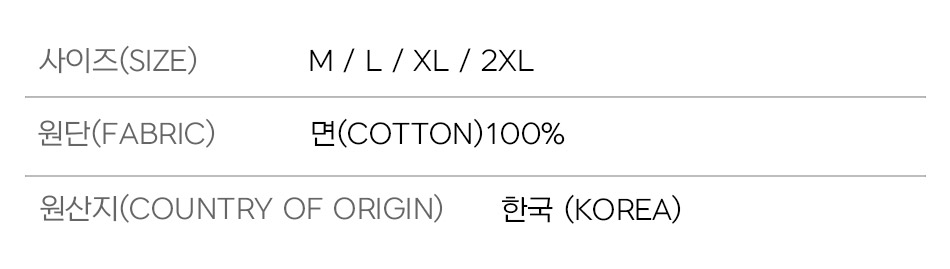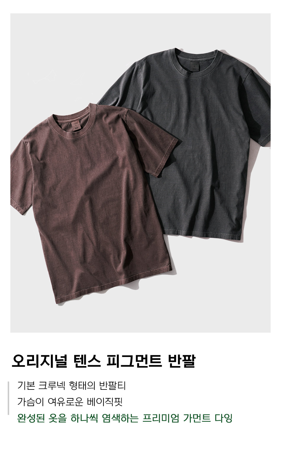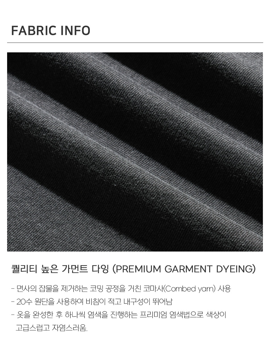 특징 면사의 잡물을 제거하는 코밍 공정을 거친 코마사(Combed yarn)사용, 20수 원단을 사용하여 비침이 적고 내구성이 뛰어남, 옷을 완성한 후 하나씩 염색을 진행하는 프리미엄 염색법으로 색상이 고급스럽고 자연스러움