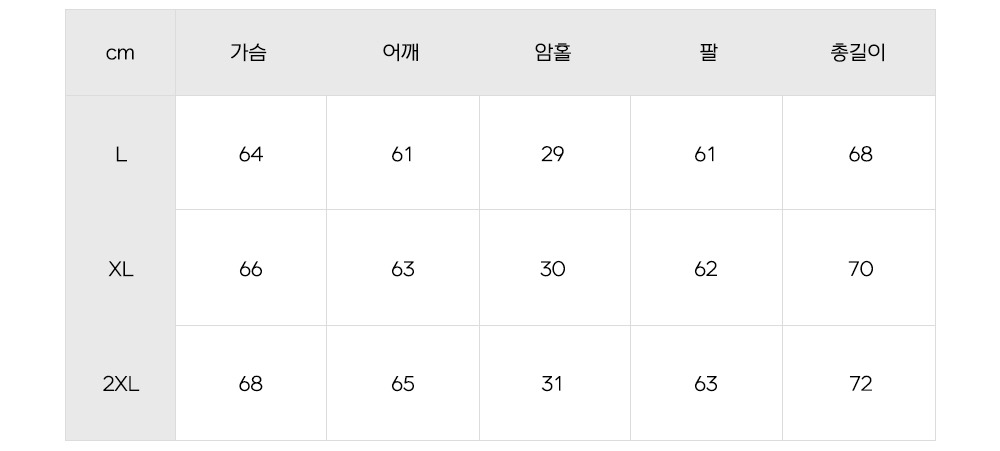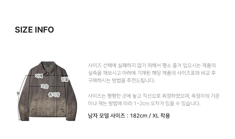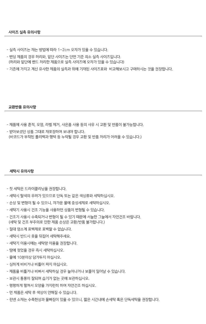 제품 제작 과정에서 같은옷에 같은 사이즈더라도 1~3cm정도의 오차는 발생할 수 있습니다. 그러므로 약간의 사이즈 오차로 인한 교환/반품은 불가합니다.