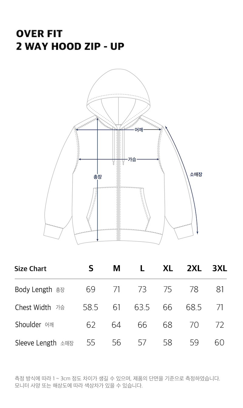 제품 제작 과정에서 같은옷에 같은 사이즈더라도 1~3cm정도의 오차는 발생할 수 있습니다. 그러므로 약간의 사이즈 오차로 인한 교환/반품은 불가합니다.