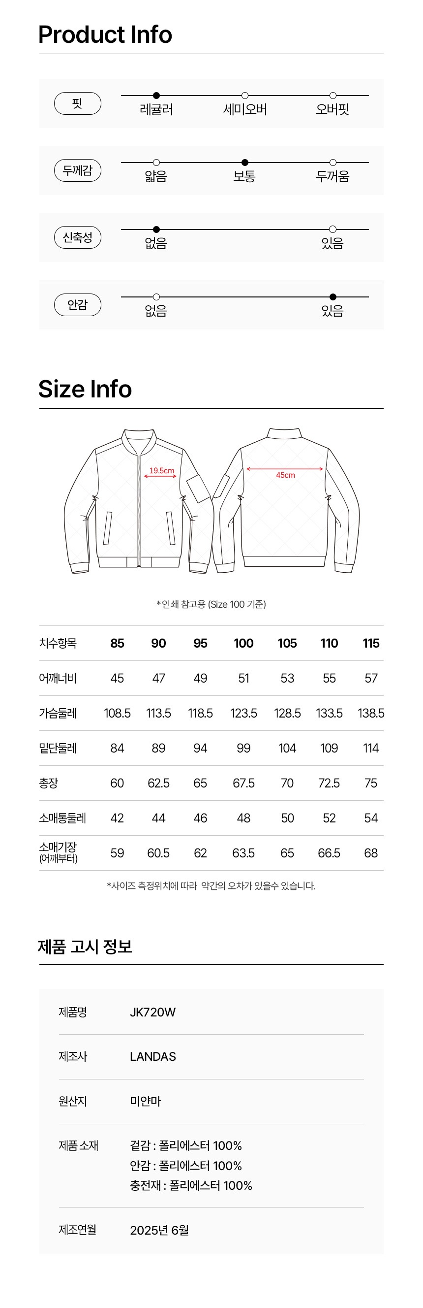 제품 제작 과정에서 같은옷에 같은 사이즈더라도 1~3cm정도의 오차는 발생할 수 있습니다. 그러므로 약간의 사이즈 오차로 인한 교환/반품은 불가합니다.