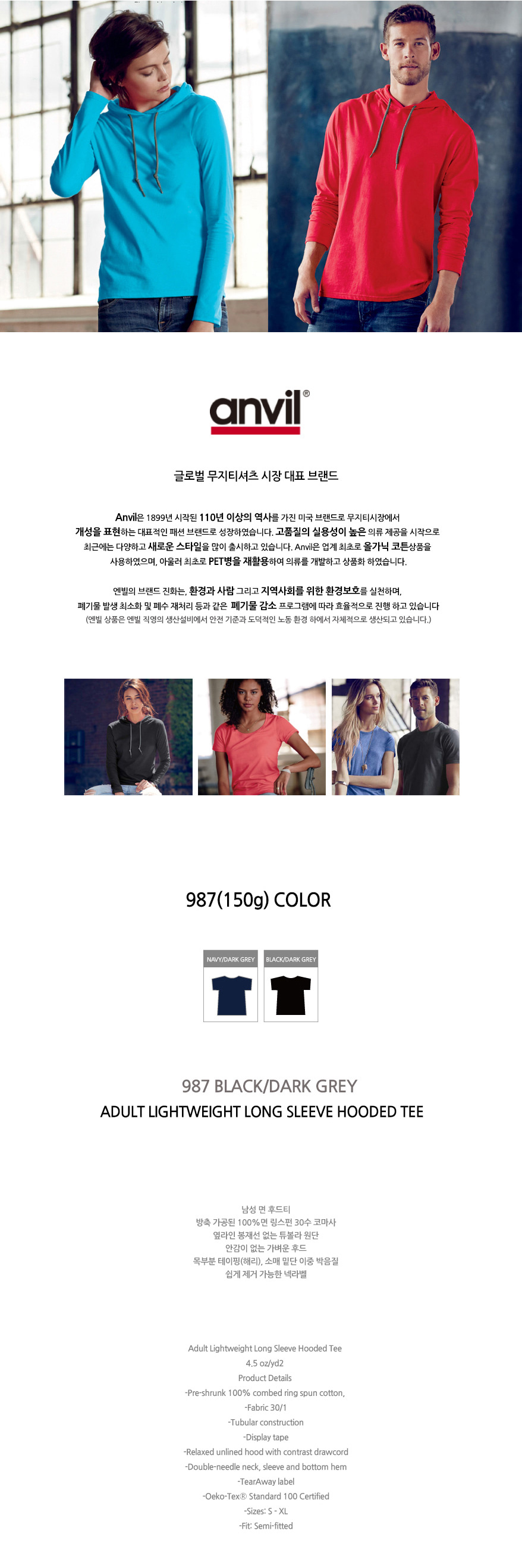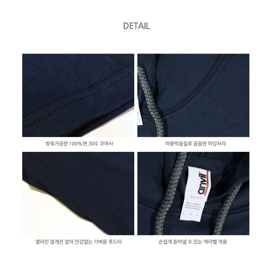 특징 안감이 없는 가벼운 후드, 소매와 밑단의 이중박음질, 쉽게 제거가능한 넥라벨(anvill)