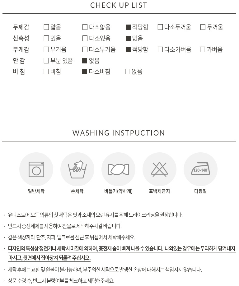 세탁후에도 변형이 적고 착용시에도 구김이 잘 가지 않습니다.