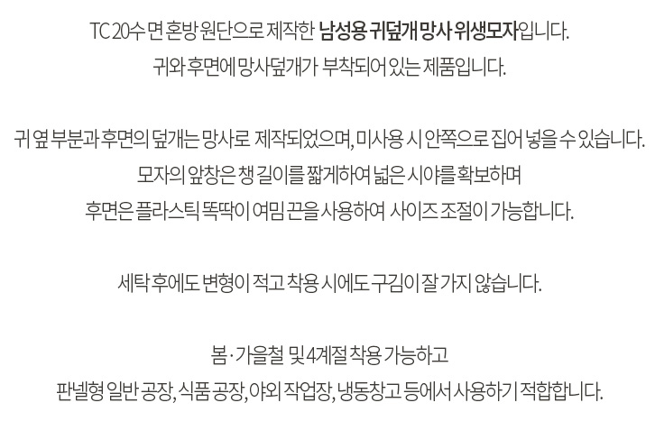 특징 귀옆부분과 후면의 덮개는 망사로 제작되었으며, 미사용시 안쪽으로 집어넣을수있습니다. 모자의 앞창은 챙길이를 짧게하여 넓은 시야를 확보하며 후면은 플라스틱 똑딱이 여밈끈을 사용하여 사이즈조절이 가능합니다. 봄, 가을철 및 4계절 착용가능하고 판넬형 일반공장, 식품공장, 양외작업장, 냉동창고등에서 사용하기 적합합니다.