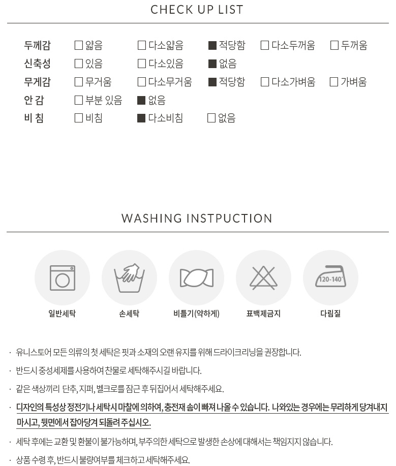 세탁후에도 변형이 적고 착용시에도 구김이 잘 가지 않습니다.