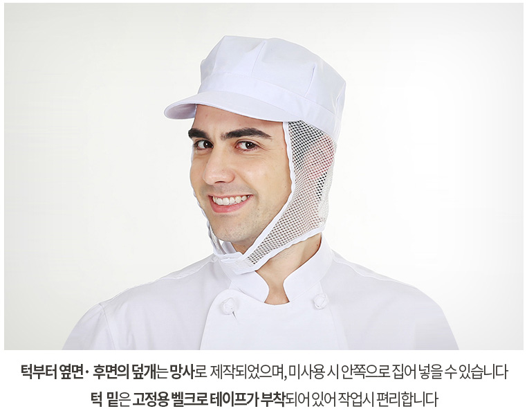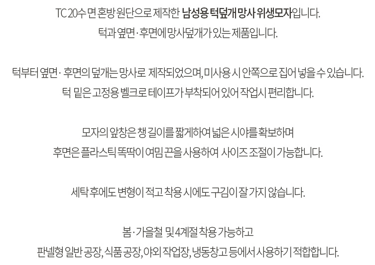 특징 턱부터 옆면,후면의덮개는 망사로 제작되었으며, 미사용시 안쪽으로 집어 넣을수있습니다. 턱밑은 고정용 벨크로 테이프가 부착되어있어 작업시 편리합니다. 봄, 가을철 및 4계절 착용가능하고 판넬형 일반공장, 식품공장, 양외작업장, 냉동창고등에서 사용하기 적합합니다.