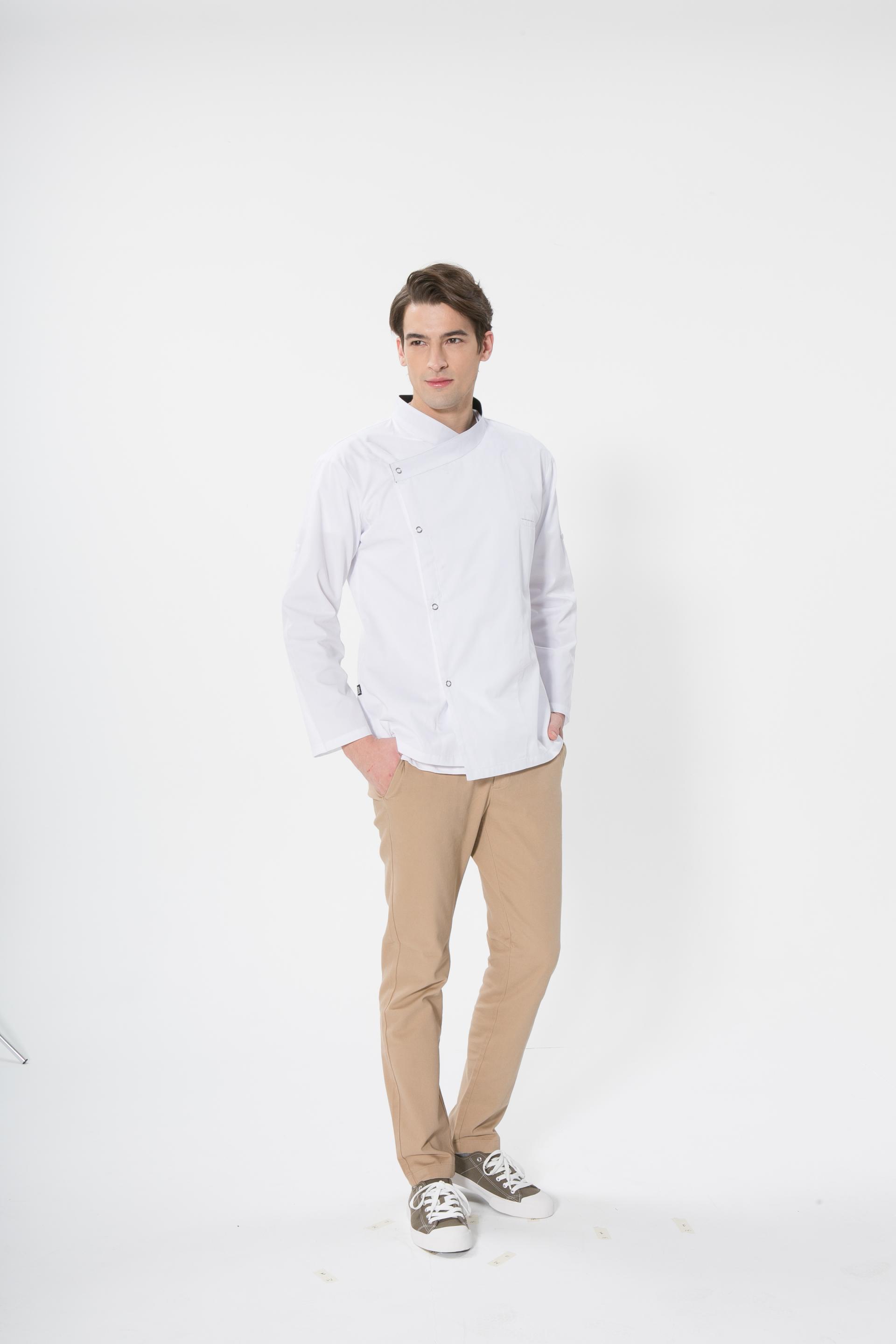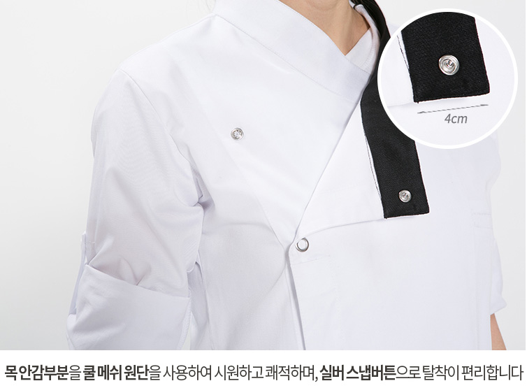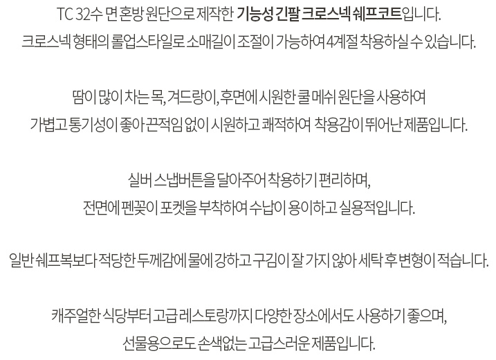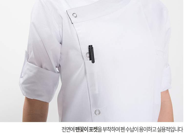 특징 실버스냅버튼을 달아주어 착용하기 편리하며, 전면에 펜꽂이 포켓을 부착하여 수납이 용이하고 실용적입니다. 캐주얼한 식당부터 고급레스토랑까지 다양한 장소에서도 사용하기 좋으며, 선물용으로도 손색없는 고급스러운 제품입니다.